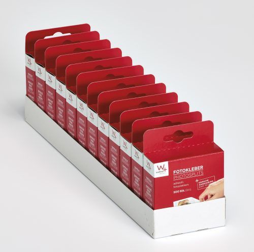 Dobbeltsidet hvide syrefri fotoklæber. 500 styk per æske. 12 æsker per display
